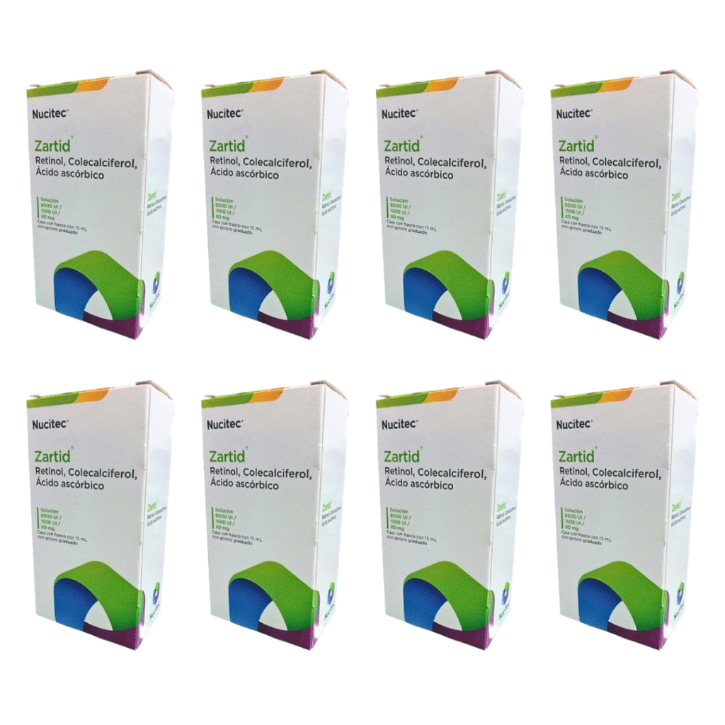 Zartid. Retinol, Colecalciferol, Ácido Ascórbico. Solución 8000 UI / 1500 UI / 80 mg. Caja con frasco con 15 ml. con Gotero graduado. Contiene un pack de 8 piezas. Reg. No. 049V2002 SSA IV